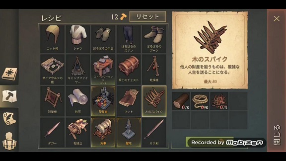 「木のスパイク」を1個クラフトするには、「松の木の丸太」と「ロープ」が8個ずつ、「銅のかけら」が4個必要となります。