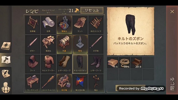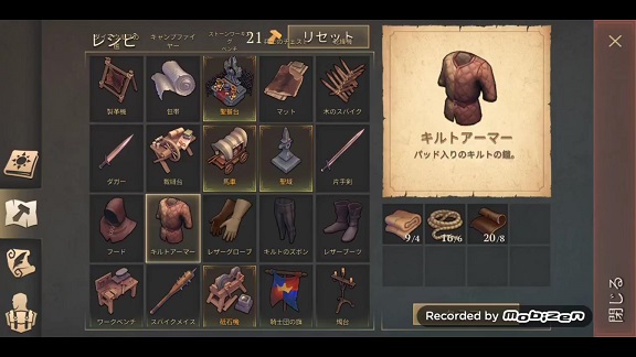 キルト入りアーマーをクラフト、キルトのズボンをクラフト、レザーブーツをクラフトとなります。
