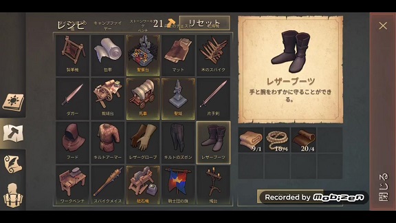 「レザーブーツ」をクラフトするには「厚手の布」が1個と「ロープ」と「革」が4個ずつ必要です。