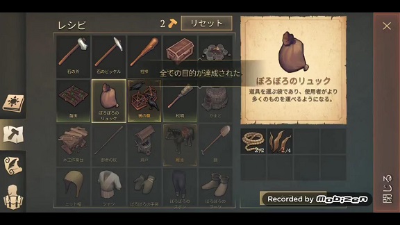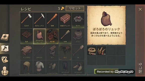 「ぼろぼろのリュック」をクラフトするには「ロープ」2つと「亜麻繊維」が4つ必要となります。