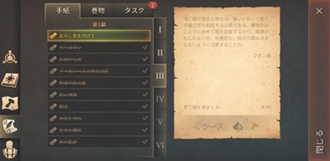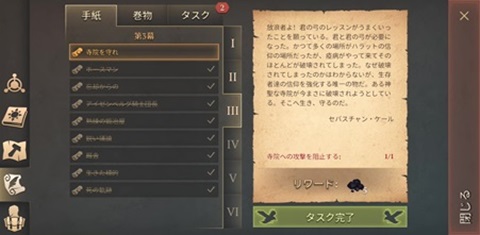 本拠地に戻り手紙を読んでみると「タスク完了」が押せるようになっています。