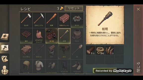 「松明」をクラフトするには「松の木の丸太」2つと「ロープ」が2つと「亜麻繊維」が3つ必要となります。