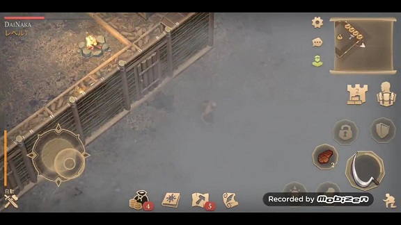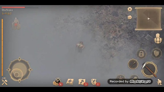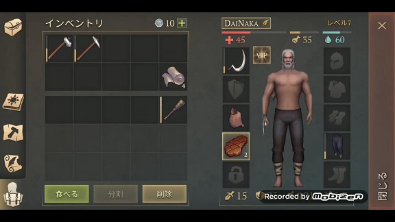 「鎌」と「ぼろぼろのズボン」と「焼いた肉」を装備して、「石の斧」と「石のピッケル」を持っています。